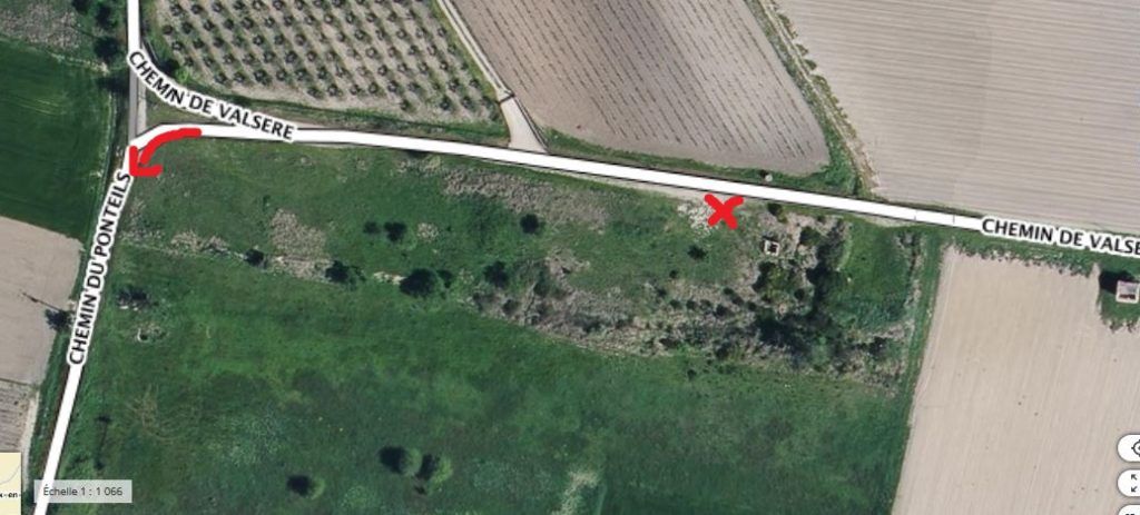 - Départ : Eguilles, chemin de Valsère avant l’embranchement de celui-ci et du chemin du Boulidou ou bien sur le petit parking du hameau de Valsère. Voir cartes plus bas. Accès possible : depuis la gare routière au nord d’Eguilles (stade/salle omnisports) descendre le chemin des Lauriers, au rond-point, laisser à droite le ch. de Fabrègues, continuer et prendre peu après à droite le chemin de Valsère, le suivre sur env. 1,5 km et se garer sur la gauche avant la fourche du ch. de Valsère et du ch. du Boulidou.